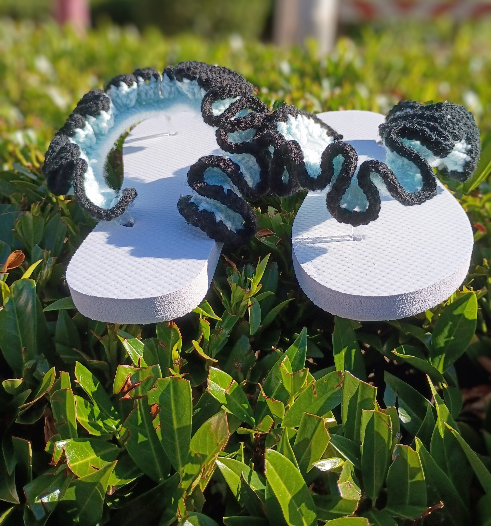 Step into cool comfort with our Arctic Ice Elegance crochet flip-flops, made from soft 100% acrylic “I Love This Yarn.” A stunning blend of icy blue and classic black creates a sleek, bold outline. Designed on white flip-flop soles (sizes 5–10), these sandals are perfect for both casual days and sunny getaways. Handcrafted with care and built to last.